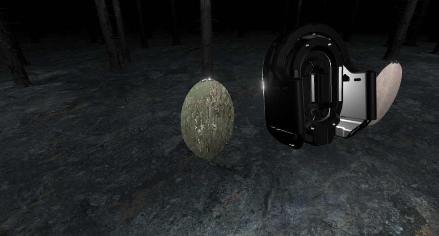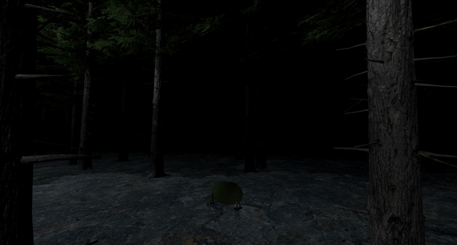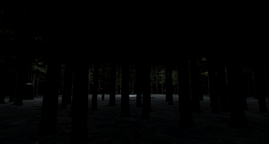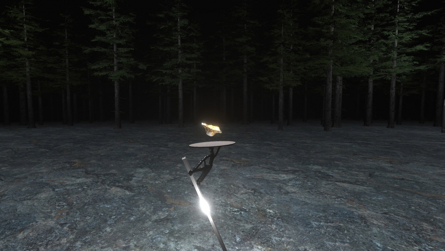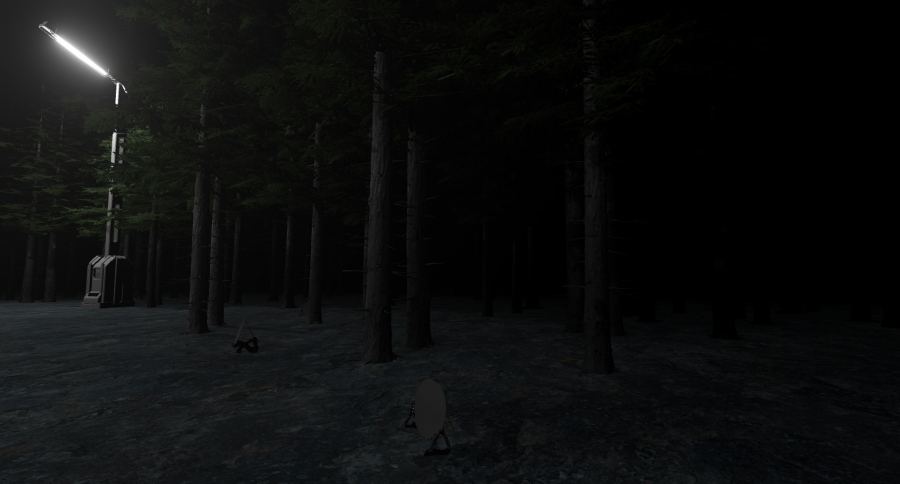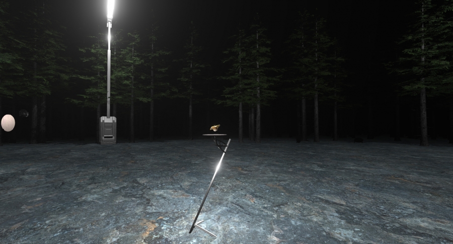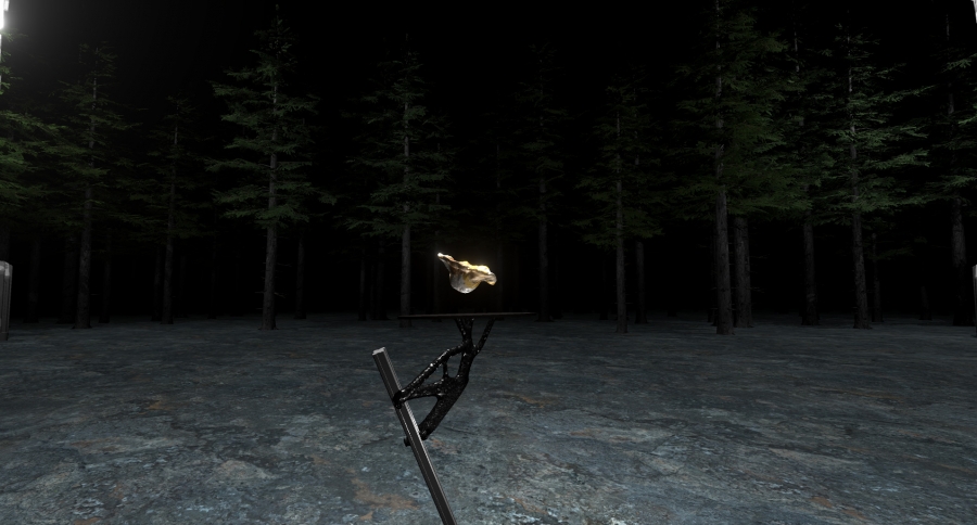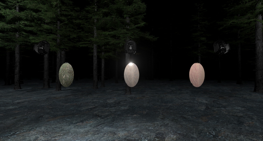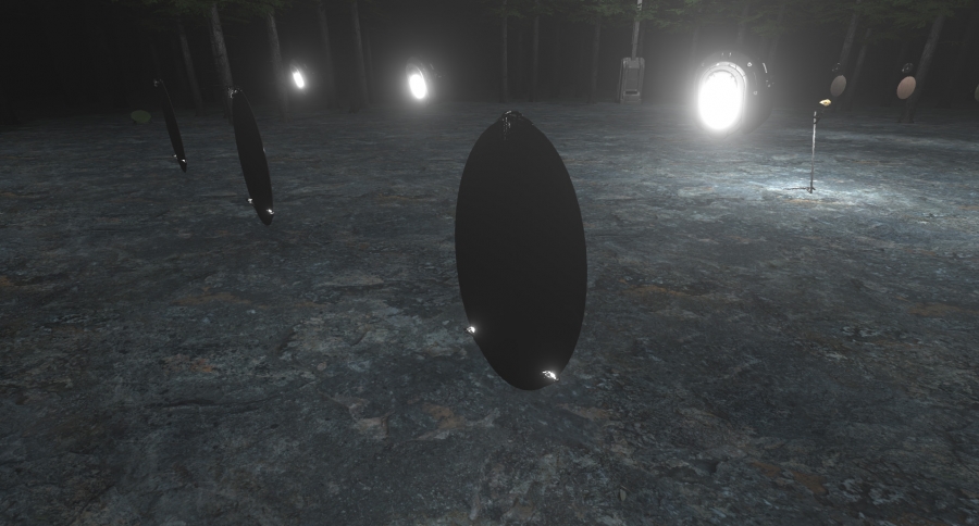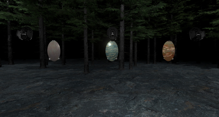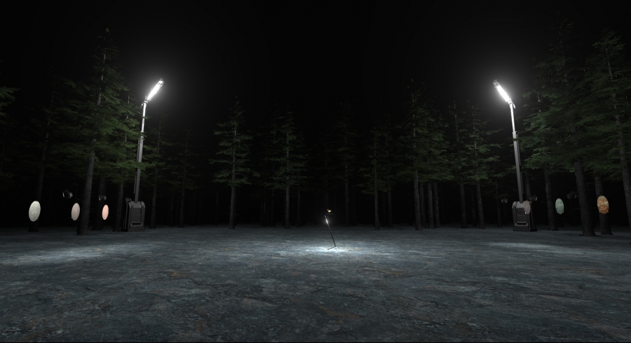 In First Contact at DOS.Exe work from Jacob Riddle’s ongoing body of work DPM∧GAN is exhibited in mysterious clearing found in the middle of a dark virtual forest. The work is lit by industrial lighting equipment as though an ominous discovery is being investigated by an unknown military.